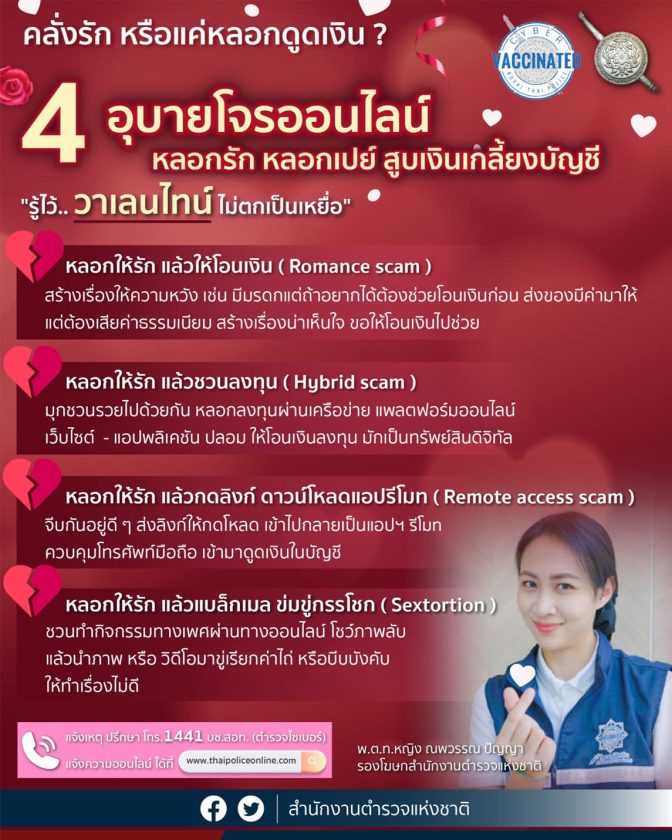 16 กุมภาพันธ์ 2023 โดย adminphonphisai เตือนภัย!! หลอกรักออนไลน์วาเลนไทน์นี้ สแกนดี ๆ เขา “คลั่งรัก” หรือ “แค่หลอกดูดเงิน” จากเรา “รองฯ ลูก