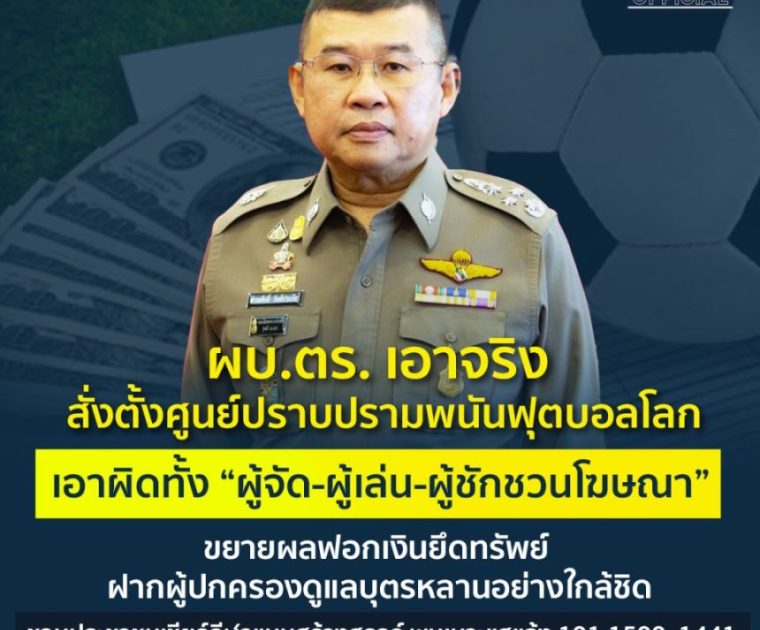 ผบ.ตร. เอาจริง สั่งตั้งศูนย์ปราบปรามพนันฟุตบอลโลก เอาผิดทั้ง “ผู้จัด-ผู้เล่น-ผู้ชักชวนโฆษณา” ขยายผลฟอกเงินยึดทรัพย์ ฝากผู้ปกครองดูแลบุตรหลานอย่างใกล้ชิด ชวนประชาชนเชียร์กีฬาแบบสร้างสรรค์ พบเบาะแสแจ้ง 191, 1599,1441