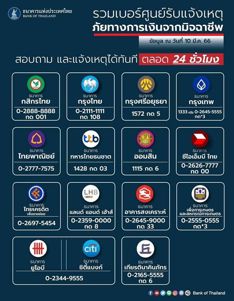 ธนาคารทั้งสิ้น 15 แห่ง ได้เปิดศูนย์รับแจ้งเหตุภัยทางการเงินจากมิจฉาชีพของธนาคาร เพื่อให้ประชาชนที่ได้รับผลกระทบ หรือตกเป็นเหยื่อของมิจฉาชีพโทรแจ้งเหตุ ได้ตลอด 24 ชั่วโมง เพื่ออำนวยความสะดวกประชาชน บรรเทาความเสียหายให้เร็วที่สุด ดังนี้
